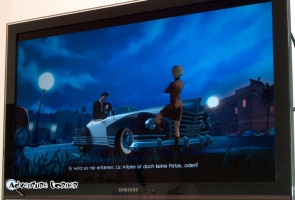 Bei Crimson Cow gibt es außer Kaffee einige interessante Informationen: Man möchte gern 'A Vampyre Story 2' machen, auch unter Mitwirkung von Bill Tiller, der den ersten Teil und die Geschichte erdacht hat, aber ohne Autumn Moon Entertainment. Man sucht einen anderen Entwickler für das Spiel. Ehe wir weiter bohren können, um wen es sich handelt, beginnt die Präsentation von 'The Next BIG Thing', dem neuen Adventure der Pendulo Studios. Da man uns noch keine Screenshots mitgeben kann, machen wir kurzerhand wieder unseren Eigenen. Witzigerweise von fast der gleichen Stelle, von der uns Crimson Cow wenige Tage später einen Screenshot per Mail schickt. Als wir nach dem Termin den Raum verlassen, entdecken wir am Stand bekannte Gesichter eines Entwicklerstudios. Zufall? ;) Wir versprechen, nicht zu verraten, um wen es sich dabei handelt.