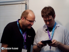 Weiter geht es zu JoWooD, bei denen wir hoffen, etwas Neues zu 'Haunted' zu erfahren. Der Besuch bei den Österreichern ist immer wie eine Schachtel Pralinen, man weiß nie, was man bekommt. Schließlich gab es im vergangenen Jahr 'Joga für die Wii' zu sehen... In diesem Jahr gleicht die Pralinenschachtel eher einen Sardinenbüchse, denn unsere Partnerseite Adventure-Treff darf sich den Termin mit uns teilen. Und Teilen ist das Stichwort. Vier Corner und acht Treff Redakteure teilen sich einen Nintendo 'DS', auf dem wir das spannende 'Playmobil Topagents' anspielen können: Das „Spy Team“ (die Guten) und die „Robo-Gang“ (die Bösen) kämpfen um die Weltherrschaft. Die Robo-Gang versucht, die Welt mit „Chaos-Kapseln“ unter ihre Kontrolle zu bringen. Das „Spy Team“ versucht dies zu verhindern. DasJan vom Treff und ich sind uns einig, dass das Spiel entfernt an 'Grand Theft Auto' erinnert. Für die Storytellers werfen wir noch einen Blick auf 'Arcania – Gothic 4', das sich deutlich an ein erwachseneres Publikum richtet. Immerhin können wir Schafe erschlagen. Das hat aber keinen guten Einfluss auf unser Ansehen. Die armen Schafe... Übrigens möchte man uns über 'Haunted', dass eigentlich ja Ende Oktober erscheinen soll, nichts sagen.