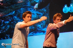 Ankündigung, dass in Zukunft sogar 'DS'-Spieler 'Sims'en können, haut uns nicht vom Hocker. Aber vielleicht könnte das neue 'Harry Potter' ja ein Storyteller werden? Nein. Trotz 'Kinect'-Steuerung (oder vielleicht auch deswegen) sieht das Spiel nicht nach großer Geschichte aus. Immerhin wird es von den Weasley-Zwillingen präsentiert - Aber auch das macht den Titel nicht interessanter. Dann endlich geht es los: Licht aus, Spot an: Bioware darf die großen Neuigkeiten verkünden. Wir sind gespannt und schreiben schon mal eine Twitter-Meldung: 'Mass Effect 3' kommt... Es muss eigentlich nur noch ein Datum in den Tweet, da kommt die erste großartige Nachricht: Der neue Trailer zu 'Dragon Age 2'. Ok, das mag ja alles toll sein, aber darum so ein Bohei? Wir schauen