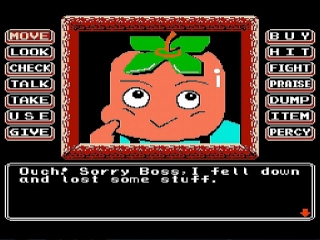Irgendwie ist das aber auch gar nicht so wichtig, denn die Spielsteuerung ist nicht an die Fortbewegungsart von Sir Gurke gebunden. Stattdessen funktioniert sie so ähnlich, wie die vieler anderer Spiele aus der Transit-Zeit zwischen Text- und Grafikadventure. In der Mitte des Bildschirms sieht man die unmittelbare Umgebung von Sir Gurke, die vom Spieler mittels verschiedener Verben beeinflusst werden kann. Die Aktionsbuttons sind rechts und links am Bildschirmrand verteilt und mit dem Steuerkreuz anwählbar. „MOVE“ bewegt euch in einen angrenzenden Bildabschnitt, wobei die Richtung nach Knopfdruck ausgewählt wird. „LOOK“ gibt euch einen allgemeinen Überblick über den im Bild präsentierten Ausschnitt. Mit „CHECK“ untersucht ihr danach die einzelnen Häuser, Gegenstände oder Personen im Bild. Neben weiteren, sich selbst erklärenden Aktionen, gibt es noch den Button „PERCY“, mit Hilfe dessen ihr Kontakt zu eurem Helfer gleichen Namens aufnehmt. Dattelpflaume Percy hat manchmal ein paar nützliche Tipps zum weiteren Vorgehen auf Lager und schleppt auch noch eure gesamte Ausrüstung herum. Die kann mittels „ITEMS“ aufgerufen und mit den anderen Aktionsbuttons verwendet werden. Auf einen Mauscursor wird daher komplett verzichtet. Der Bildausschnitt ist deswegen auch kaum interaktiv und ändert sich nur selten und fast ohne jegliche Animation, wenn man zum Beispiel einen Gegenstand wegnimmt oder ein Charakter erscheint. Die Steuerung ist einfach zu bedienen, aber die Tatsache, dass man sich mit seinem Cursor immer nur am Rand des Bildschirmsausschnitts bewegt, schafft eine gehörige Distanz zwischen Spieler und Spiel. Das steife Handling lässt sich durch das ursprüngliche Erscheinungsjahr erklären, aber für 1991, als die englische Version für das Nintendo Entertainment System erschien, ist das schon ziemlich veraltet. Man bedenke: schon 1984 durfte man sich in 'Kings Quest' wesentlich freier austoben und 1987 revolutionierte 'Maniac Mansion' das Genre durch seine Point&Click-Steuerung.