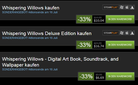 11.07.2014, 09:54Wie immer: Wer bei Kickstarter die Deluxe-Edition für 25 $ gebacken hat, könnte jetzt für einige Dollar weniger bei Steam das gleiche Paket kaufen (Startangebot bis zum 16.07.). Ich hatte damals 10$ gegeben und spare nun immerhin noch 4 Cent. Mit solchen Rabatt-Aktionen graben sich die Entwickler selbst das Wasser für zukünftige Crowdfunding-Aktionen ab.
