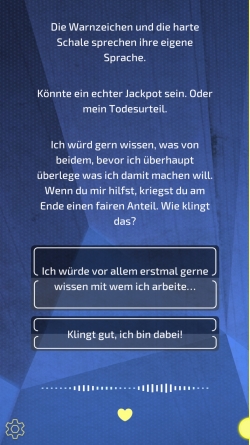 Wir empfangen einen Hilferuf, abgesetzt von Hanna. Ihre Stadt ist von einem Virus befallen, das Menschen zu hirnlosen Monstern macht - sofern sie denn Überleben. Nun geht es für Hanna um Leben und Tod und nur wir können ihr helfen. Dazu sendet uns das Spiel fortlaufend Textnachrichten - in Echtzeit und dauernd. Entweder in der App selbst oder als interaktive Push-Nachricht, mit der wir Hanna helfen können, ohne eigens die App zu öffnen.