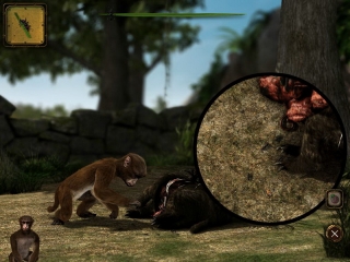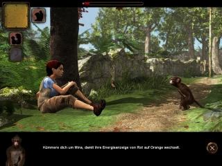 Mit anderen Affen kommunizieren kann wie bereits erwähnt nur deren Artgenosse Jep. Dies geschieht mittels Interaktions-Menü, das verschiedene Auswahlmöglichkeiten wie „Geben“, „Lausen“, „Ablehnen“ oder „Einschüchtern“ zur Verfügung stellt und die daraus resultierende Körpersprache ausführt. Wir sehen also auch eine entscheidende Änderung zum ersten Teil, denn endlich kann persönlich in die Haut von Jep geschlüpft werden. Ein Logikloch, bei dem der kleine Affe immer automatisch wusste was zu erledigen ist, wurde somit also gestopft. Dennoch wirkt Minas Helfer auch weiterhin äußert hochbegabt. So weiß er problemlos, welche Pflanzen zur Versorgung von Minas Wunde geeignet sind und ist sogar fähig, entsprechende Wunde ärztlich zu versorgen.
