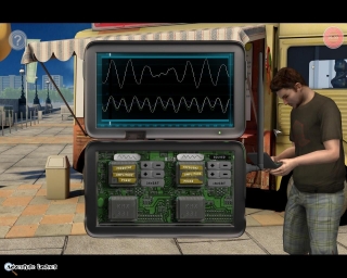 Was wäre ein Adventure ohne Rätsel? Eine zugegebenermaßen rhetorische Frage. Doch genau dieses schwerwiegende Phänomen wird bei '15 Days' offenkundig, vor lauter geplanter Story- und Charakterentwicklung blieb scheinbar kein weiterer Raum für etwas spielerische Herausforderung. An Rätseln hatte man scheinbar kaum Interesse, weswegen man beinahe komplett auf sie verzichtet und diese durch kleinere Minispiele ersetzt hat, die nicht besonders interessant, sondern eher ernüchternd ausfallen. Als anführendes Beispiel muss beim London Eye, ein Riesenrad in London, ein kleines Minispiel gelöst werden, um die Steuerung über jene Attraktion übernehmen zu können. Dazu muss Mike auf seinem selbst gebastelten Transmitter einen unteren Wellenverlauf mit dem oberen des London Eye synchronisieren. Die weiße Kurve wird durch eine weitere grüne und blaue Kurve gebildet, die jeweils mit Einstellungen zu Frequenz und Amplitude verändert werden können. Zwar dürfen wir uns mit einem klick auf das Hilfesymbol anlesen, was für Auswirkungen diese beiden Einstellungen auf eine Kurve haben, kennt man sich darüber hinaus mit Interferenzen aber nicht aus, bleibt nur noch ein Ausprobieren nach bester Trial and Error-Manier. Verliert man schon bald die Geduld, können nach Ablauf eines 2-minütigen Timers die Minispiele auch übersprungen werden.