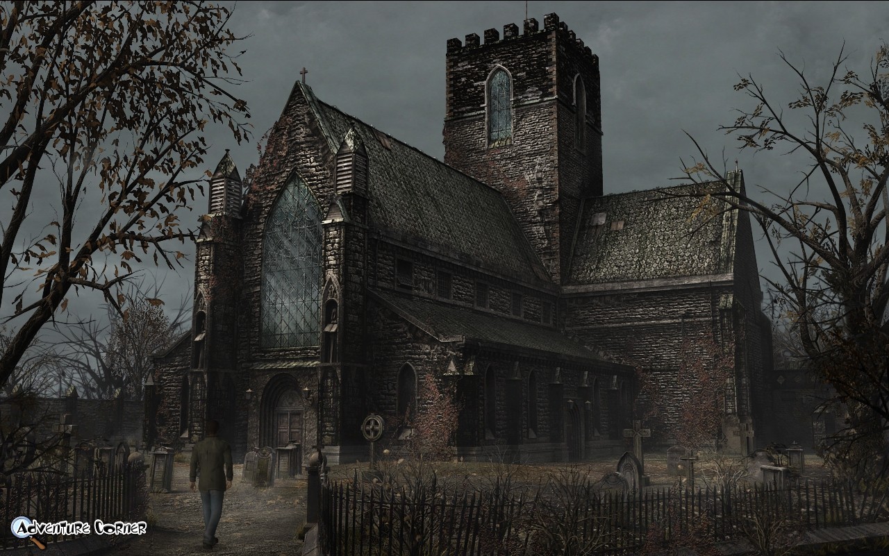 Reisen kann man übrigens recht bequem mithilfe einer Wanderkarte, die Adrian aus dem Tante-Emma-Laden abstaubt. Hier genügt ein Druck auf die Taste „M“ auf der Tastatur und anschließend kann man bereits besuchte Orte auf der Karte auswählen, um im Eiltempo dorthin zu eilen. Eine Möglichkeit, dass Adrian in einem normalen Bildausschnitt rennt, gibt es leider nicht. Er kann zwar Wege durch einen Doppelklick überspringen, aber das funktioniert leider nicht immer. Da ist die Wanderkarte schon nicht schlecht. Und wohin führt der Weg unseres Wanderers so? Die Locations sind in erster Linie Orte, die man aus den Vorgängern bereits kennt. Black Mirror selbst spielt natürlich eine bedeutende Rolle, ebenso wie die Kirche und Willow Creek. Dabei hat man sich Mühe gegeben, eine Balance aus den wichtigen alten Schauplätzen und neuen Orten zu schaffen. In Willow Creek gibt es also nach wie vor den Pub, nur dass Adrian ihn nicht betritt. Dafür wurde das Nest aber um den Dorfplatz erweitert, den man im zweiten Teil noch nicht hatte. Und das Schloss sieht nach dem Brand auch anders aus. Die Hintergründe sind hübsch und sehr detailreich. Gegenüber dem zweiten Teil gewinnen sie an Schärfe und verlieren etwas an Farbe. Denn grau und trübe geht es zu. Über Willow Creek hängt eine dichte Wolkendecke, die Adrians Gemütszustand schön widerspiegelt. Dennoch ist die Grafik nicht auf dem neuesten Stand der Dinge. Von Gesichtsanimationen ist kaum was zu sehen. Ja, die Figuren öffnen den Mund, wenn sie sprechen und wenn man genau hinsieht, aber von Emotionen ist kaum was zu erkennen. Dazu „verschwinden“ die Figuren zu sehr vor den Hintergründen. Außerdem sind die Bewegungen doch recht abgehakt. Umso besser, dass das Spiel eine Glanzleistung im Bereich Musik und Vertonung liefert.