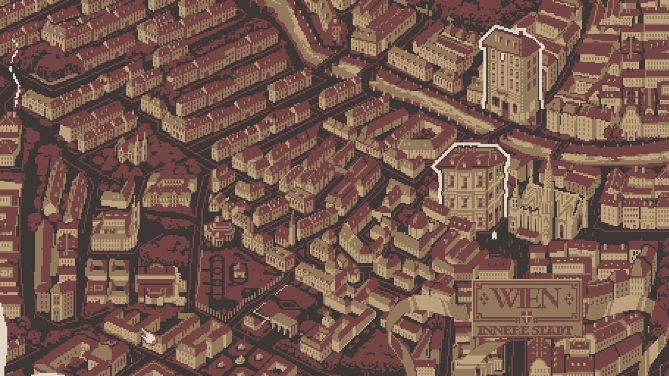 Zurück zum Gameplay: Im Wesentlichen besteht es daraus, Dialoge weiterzuklicken, auszuwählen oder auf Personen bzw. Gegenstände in der näheren Umgebung zu klicken, um so entweder einen weiteren Dialog auszulösen oder eine Aufgabe zu meistern. So müssen wir Wilma von den Geräuschen in ihrer Umgebung ablenken, indem wir die z.B. die tickende Uhr anklicken oder einfach mal nach draußen gehen. Wir müssen Franz beim Malen helfen, indem wir seinen Modellen die richtigen Fragen stellen. Und für Emma dürfen wir mathematische Aufgaben lösen, die aber selbst für Leute wie mich, die von höherer Mathematik null Ahnung haben, leicht zu schaffen sind. Der Schwierigkeitsgrad ist relativ niedrig; die Machen stellen ganz klar die Geschichten in den Vordergrund. Dabei können wir uns mit Wilma kaum bewegen und verweilen größtenteils an einem Ort. Mit Franz wird die Sache dann schon etwas vielfältiger: Über eine Karte von Wien können wir zwischen Franz' Atelier und dem Salon von Gustav Klimt (ja, wir treffen Klimt!) sowie dem Markt und dem oben erwähnten Kaffeehaus wechseln, wobei die beiden zuletzt genannten Orte nur dann auf der Karte auftauchen, wenn sie auch für die Handlung relevant sind. Ähnlich verhält es sich bei Emma: Zentral für ihre Geschichte sind das Kaffeehaus, ihre Wohnung und die Universitätsbibliothek. Bei Emma kommt noch ein weiterer Faktor hinzu, der in die Karte integriert wurde und uns einige Laufwege spart: Da sich Emma verkleiden muss, um in die illustre Runde der Herren Mathematiker eingelassen zu werden, können wir über eine schön gestaltete Schaltfläche direkt auf der Stadtkarte den Kleiderwechsel veranlassen, ohne zuerst in Emmas Wohnung zu gehen, dort die gewünschte Kleidung zu suchen und dann wieder zum Stadtplan zurückzukehren. So sparen wir Zeit, und die Idee, den Kleidertausch in die Übersichtskarte zu integrieren, hat was.