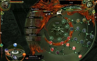 Rund ist auch der Talentbaum. Genauer gesagt halbkreisförmig. Attribute, Magie und Schwertkampf sind hier untereinander angeordnet. Jedes dieser Menüs beinhaltet ein Untermenü mit Fertigkeiten zum Freischalten. „Kräuterkunde“ kann Geralt z. B. nur ab einer bestimmten Intelligenzstufe erlernen. Die einzelnen Talente sind dann noch mal in die verschiedenen Klassen Bronze, Silber und Gold unterteilt. Zu Beginn gibt es beim Levelaufstieg nur bronzene Talentpunkte, später kommen Silber- und Goldtalente hinzu. Zu beachten ist allerdings, dass die Anzahl an Talenten begrenzt ist und man nicht alle Aufwertungen abstauben kann. Der Charakteraufbau sollte daher ein wenig geplant werden.